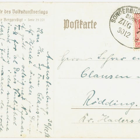 Postkort med flot bureaustempel Sonderburg-Norburg 25.1.1909. Sendt til Holm pr. Nordborg. Motivsiden - der har haft besøg af sølvfisk - viser Nyborg Slot med slotsgraven.