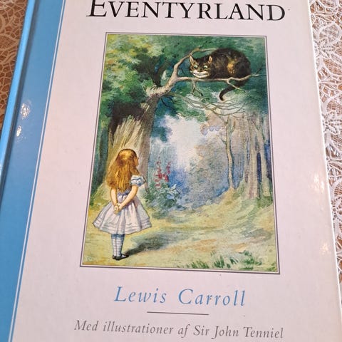 Dansk udgave som er illustreret af John Tenniel. Indbundet med smudsomslag med rifter i top.