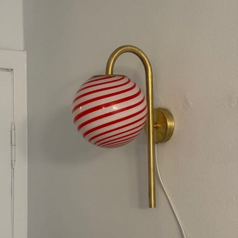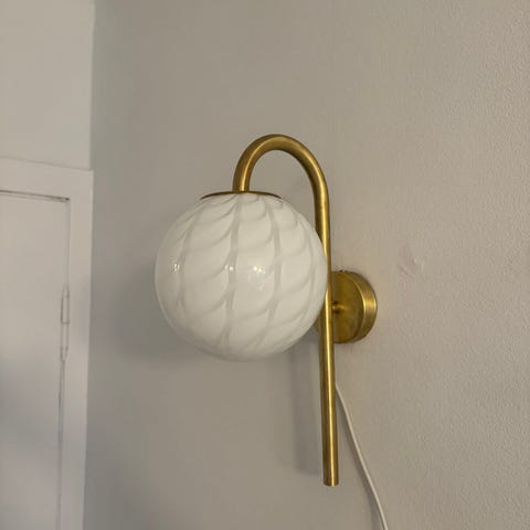 Flotteste Murano væglampe med messing beslag. Højden er 44 cm og kuglen har en diameter på 20 cm. Lampen kan vende begge veje.
