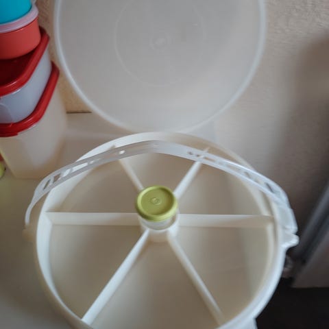 Tupperware serverings center fejler intet har hvid farve inden i og sådan en brun farve uden på. Sender ikke.