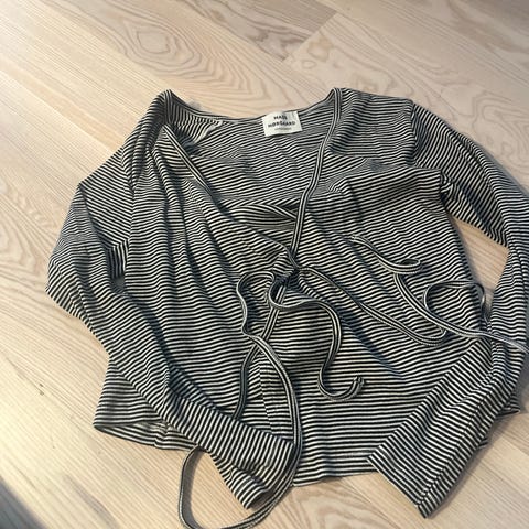 Elegant Mads Nørgaard Copenhagen blazer i en flot beige nuance. Blazeren har en unik lukning med en enkelt knap og 3/4 ærmer. Perfekt til at tilføje et sofistikeret touch til ethvert outfit. Med fore. Brugt få gange, minimal alm brugspor, ingen defekter. Mål på billeder