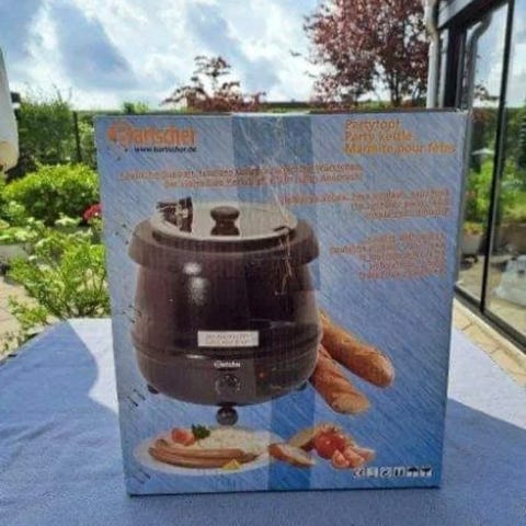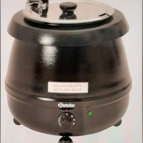 Elektrisk suppegryde med en kapacitet på 6 liter. Gryden er sort med en indvendig beholder i rustfrit stål. Den har en justerbar termostat til temperaturkontrol og et stållåg med låsemekanisme. Velegnet til opvarmning og tilberedning af supper og varme retter. Har 2 stk 500 pr stk