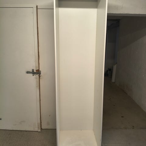 Skab med dobbeltdøre. Isoleret. Jeg har aldrig fået sat en topplade/arb. plade på (der bør dække ud over dørene) som ellers var meningen, hvorfor der kommer en smule vand ind. Er tidligere malet udvendig med mat spraymaling som det godt ku bruge en opfrisker med. Indvendig er der en smule rust, det meste at det røde er farve fra slibestøv samt misfarvning fra forskellige olier. Tænker rusten let kan slibes af og det hele det indvendige opfriskes med hammerite spray.