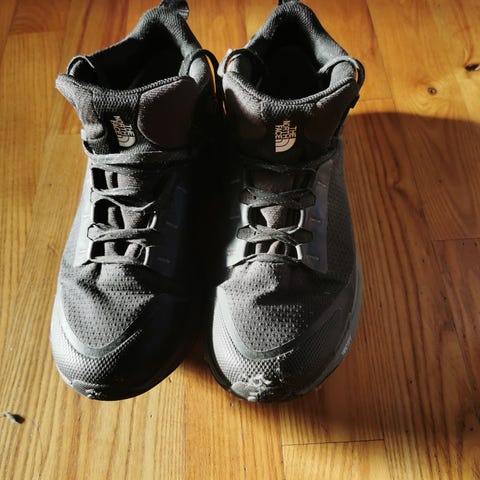 The North Face sneakers i størrelse 46. Skoene er hvide med orange detaljer og har en robust sål designet til hverdagsbrug eller en tur i skoven samt vandring.