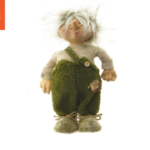 En vintage dukke på 30 cm iført stribet tøj. Dukken har håndlavet udseende med detaljeret påklædning. Den står fast på trælignende fodplader og har stofarme og -ben. Dukken har stribet bukser med ensfarvet overdel, samt robust hår. Materialet ser ud til at være kombineret tekstil og træ.