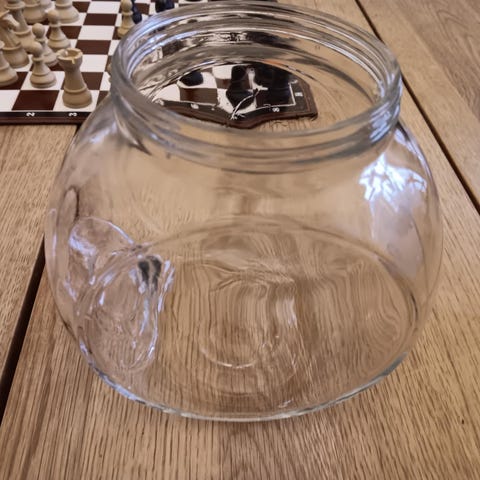 Antik glaskrukke med en højde på 15 cm, forsynet med låg i "sølv". Det gennemsigtige glas med smukke sleben udskæringer har en enkel udstråling, og låget kan nemt fjernes. Glaskrukken har oprindeligt været til kiks, men kan bruges til slik, stearinlys eller blot som smuk dekoration.