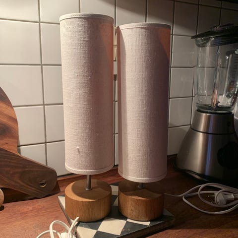 Fem kvadratiske lampeskærme i beige farvet hørstof, designet til at blive monterer på bord- eller gulvlamper. Den nedre bredde er 18 cm x 25 cm, hvilket gør dem velegnede til mindre lamper.
