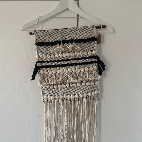 Et dekorativt vægtæppe i vævet tekstil med frynser nederst. Det er lavet med grå og beige nuancer og måler 67x56 cm. Tæppet er vævet omkring en træstok og kan hænges op som en dekorativ indretning i hjemmet. Det har et mønstret design med varierende tekstur i vævningen for et kunstnerisk udtryk.