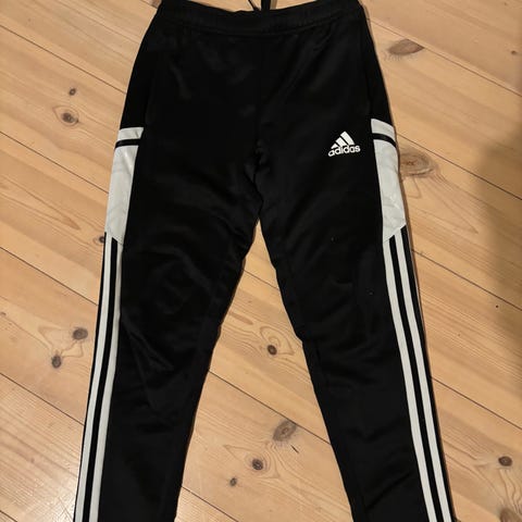 Grå træningsbukser med lyserøde striber på siderne. Der er en elastisk linning og manchetter ved anklerne. Adidas-logoet er placeret på forsiden.