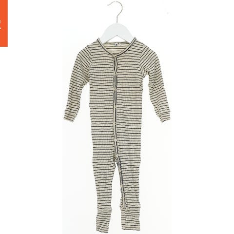 Mørkeblå denim heldragt med flæser på stropperne. Heldragten har elastisk talje og en flæsedetalje på skuldrene. Materialet ligner denim og har gyldenbrune syninger. Passer til mindre børn.