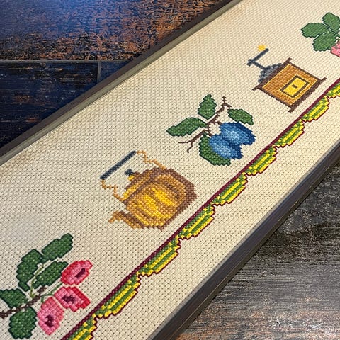 Med broderede tal, bogstaver, blomster, dyr, mennesker, m.m.
