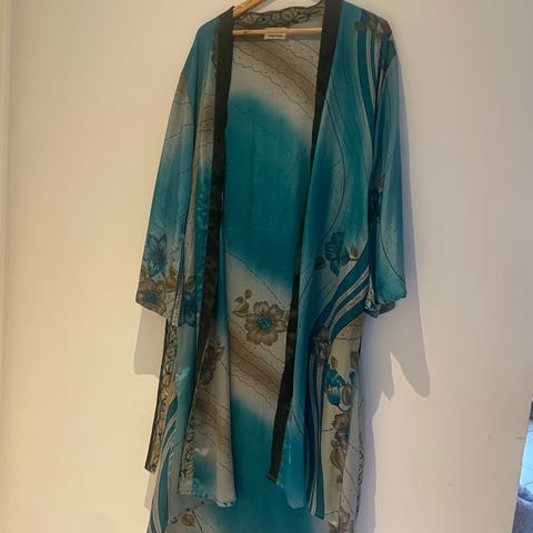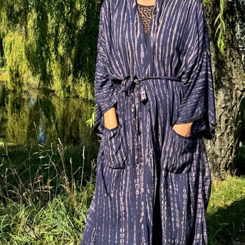 Denne tie-dye kimono kombinerer traditionelt japansk design med moderne slow fashion principper. Med sin flydende silhuet, slidser og brede ærmer har denne kimono en afslappet og stilfuld pasform.