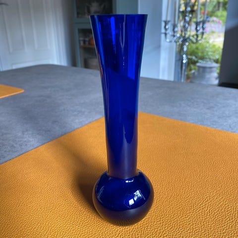 Flot Blå glas vase. Fod af klart glas. Ca 16 centimeter.