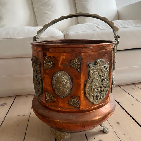 Antik kobbergryde med jernhåndtag og rustik overflade
