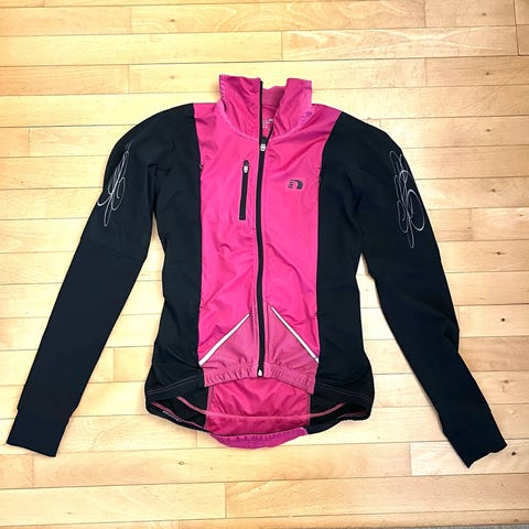 Jakken har en fuld lynlås foran og er designet til cykling med funktionelt materiale, der sikrer komfort og bevægelsesfrihed under aktivitet.
