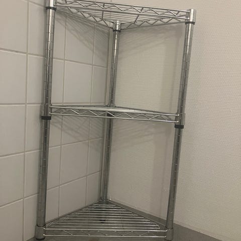 Rustfrit stål hjørnehylde til badeværelse med to niveauer til opbevaring af diverse toiletartikler. Designet til at passe i hjørner og maksimere pladsudnyttelsen.
