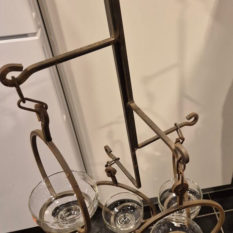Lysestager / blomsteropsats. Stager i smedejern, formet omkring dråbeformet glas. Højde: 79 cm. Diameter: 20 / 16 cm. Pris for sættet: 450 kr. Kan ses / afhentes i 6600 Vejen.