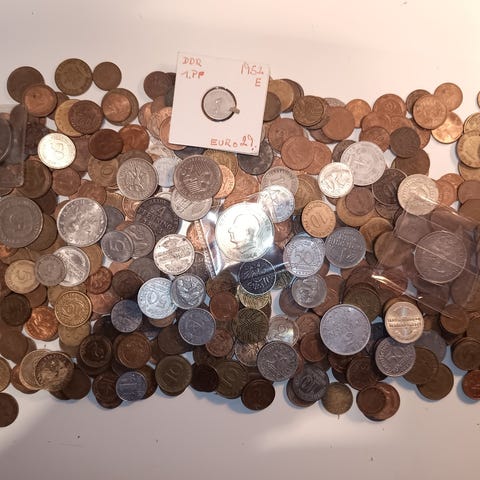 Frans Suell samlekasse i træ med flere rum for oppbevaring av mynter og små gjenstander. Kassen har et lokk med lås og er merket med Frans Suell-logoen på toppen. Fyldt med gamle svenske mønter