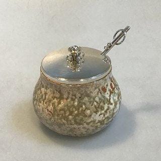 Marmeladekrukke af stentøj dekoreret med koboltblå glasur med gråblå elementer. Bundsignatur for Bode Willumsen og sølvsmed Hans Hansen 1937. Tilhørende låg af sterlingsølv (Hans Hansen 1939) og håndsmedet ske, tretårnet (Magasin du Nord, antagelig ca. 1939). H incl. låg: 9 cm - B (hvor bredest) : 9 cm