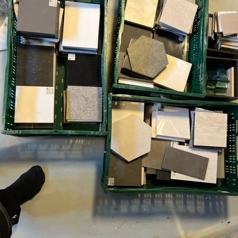 Fliseprøver fra Næstved flisecenter. Vintage xb glaserede fliser, fåes i tre størrelser, her to af den aflange model i farverne alfazema og papaia.