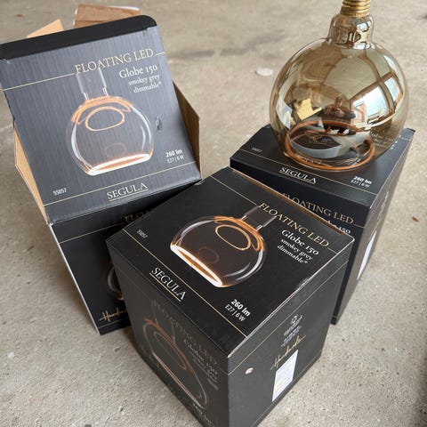 ny/ubrugt, med 18 nye LED-pærer (2,5 W/samlet 45 W), 165 cm høj, 36 cm i diameter, a la "Sputnik". 2 stk. haves - den ene er usamlet i original kasse og dermed let at sende (109 kroner med GLS til en pakkeshop). Den anden skal afhentes.