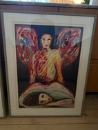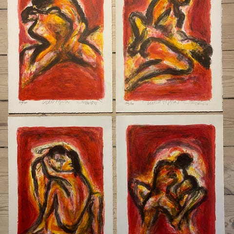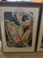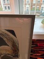 To kunsttryk med abstrakte figurer, hver indrammet med glas og hvide passepartouter. Rammerne er i træ i irgrøn nuance.