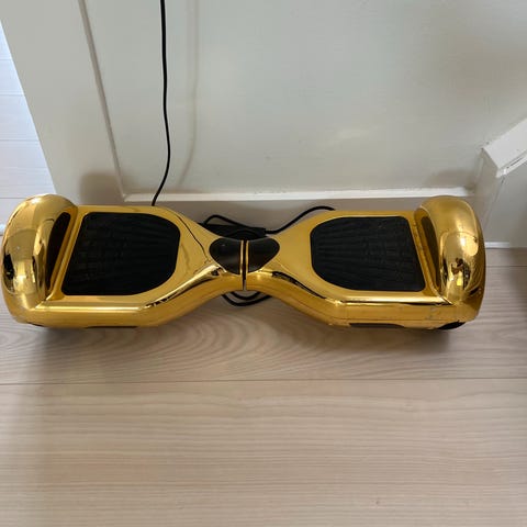 Elektrisk segboard i sort farve med tilhørende blå transporttaske. Segboard oplades via medfølgende oplader. Designet til personlig transport.