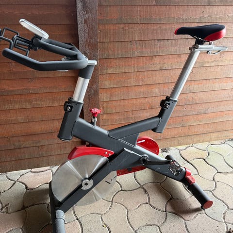 Peak Fitness Spinningcykel til indendørs brug med sort stel. Købt juli 2024. Udstyret med justerbart sæde og styr for tilpasning til brugerens højde. Indeholder en elektronisk skærm til overvågning af træningsdata. Designet til træning og konditionstræning i hjemmet eller fitnessmiljø.