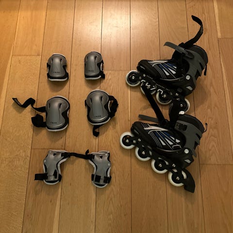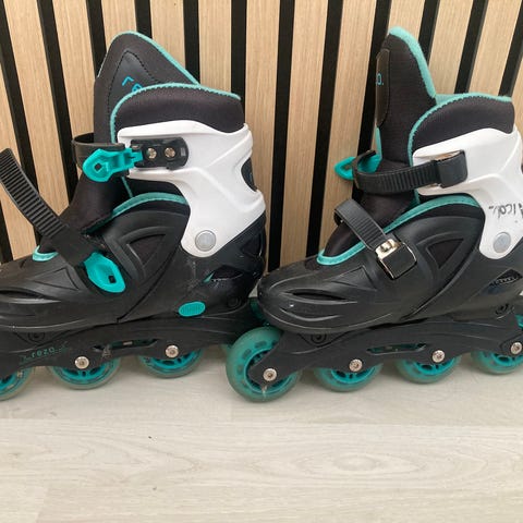Rulleskøjter til børn i størrelse 35-38. Sættet inkluderer også beskyttelsesudstyr bestående af håndleds-, albue- og knæbeskyttere. Kun brugt ganske få gange.