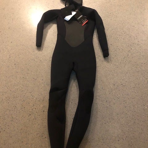 5mm tyk Våddragt med hætte i sort fra XCEL i størrelse 6. Det er en kvindemodel, som passer 168-178. Våddragten er tyk og kan holde dig varm i temperaturer i vandet ned til omkring 0 grader. Dertilhørende sko (str. 40) og vanter følger også med. Der kom et hul i dragten som følge af et uheld med finnen på surfbrættet. Hullet er fikset og limet over 6 omgange og der er sat en lap på, på begge sider i våddragtens materiale, og dette har ingen konsekvenser for dragtens funktion.