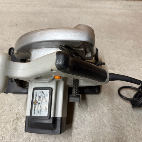 Power Square Cirkelsav med ledning. Maskinen er designet til at save træ og andre materialer. Den har et ergonomisk håndtag for bedre greb og kontrol under brug.