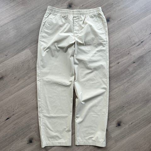 H&M bukser i beige farve til herrer, størrelse S. Bukserne har elastisk talje med snøre og flere lommer, herunder cargolommer. Materialet er let og egnet til daglig brug.
