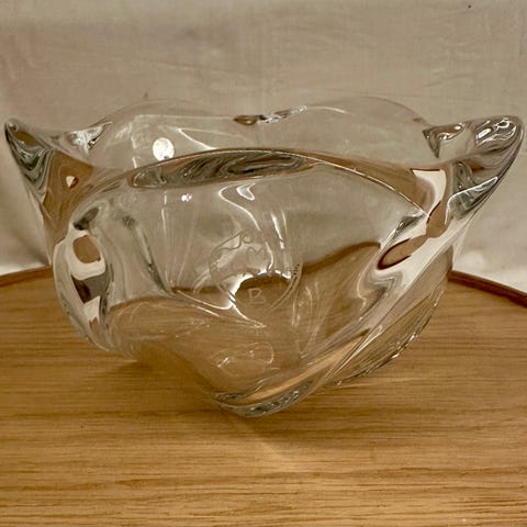 Stor og tung glasskål, designet af Allan scharff 1992, Holmegaard, dia. 24,5 cm og højde 24,5 cm, ingen ridser, fast pris evt afhentning I Bagsværd mod a conto beløb