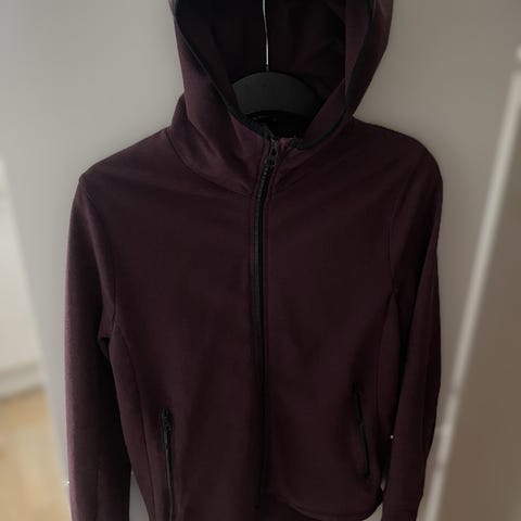 Sweatjakke / cardigan i ternet struktur og i løs, afslappet pasform. Med lynlås, hætte og lommer. Snoren i hætten er fjernet, men følger med. Letbrugt med lidt fnug.