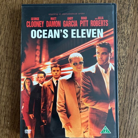 Ocean's Eleven DVD film featuring a storyline about a group planning a casino heist. The DVD includes multiple language options and special features such as behind-the-scenes footage and interviews. Suitable for viewers aged 15 and above.