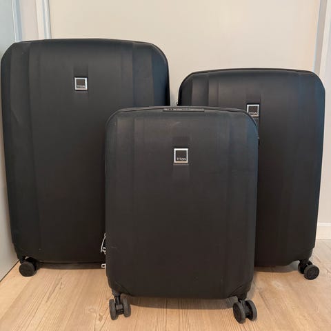 Måler 57 (med hjul) x 38 x 20 cm. Jeg får den ikke brugt så tit så standen er meget god med minimale mærker på hjul.
