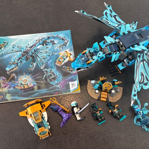 LEGO NINJAGO 71762 Drage Byggesæt med flere figurer og tilbehør. Sættet inkluderer en stor rød og gul drage med bevægelige dele, samt minifigurer og små køretøjer. Byggesættet er lavet af plast og egnet til børn. Indeholder en detaljeret manual til samling.