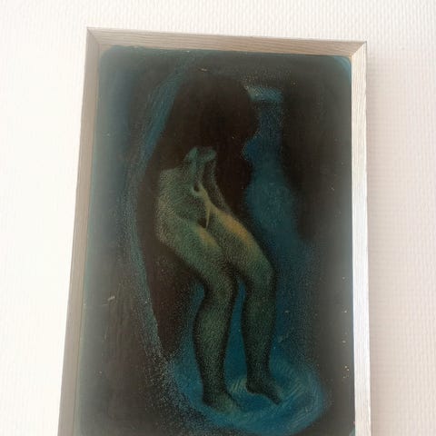 Farvetryk af SIkkerhansen med kvinde i køkkenet. Mål 34 x 32 cm