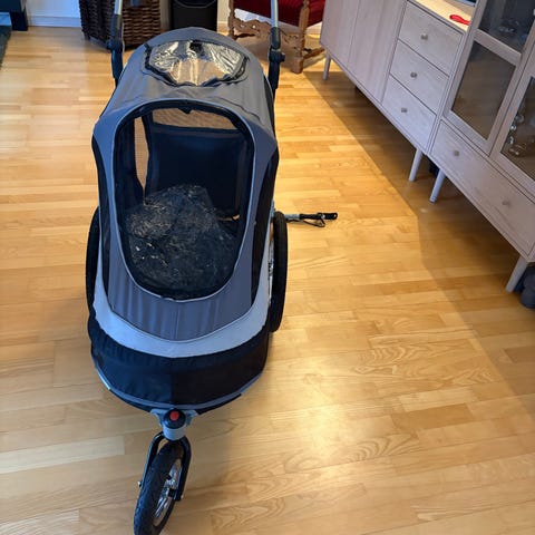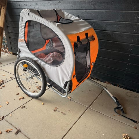 Sælger denne fine cykelanhænger som er helt ny, kun kørt 5 km . Sælges pga. voren hund ikke vil være i den - der er træk med som kan monteres på cyklens bagaksel - vognen kan nemt skilles ad så den er nem at transportere - kan også anvendes som trækvogn hvor der kan monteres hjul foran - der er håndbremse på det ene hjul