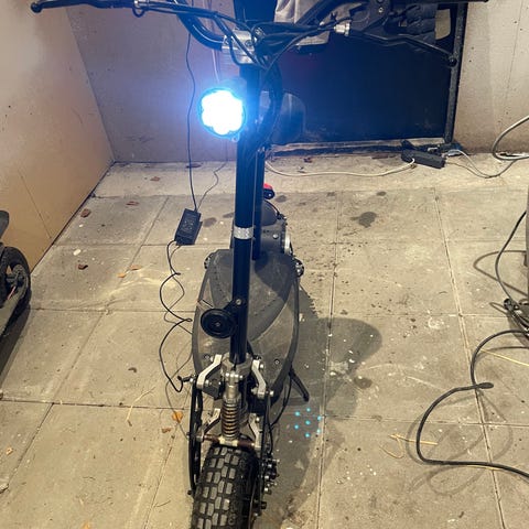 El løbehjulet har for- og baglygte med blinkende bagbremselys, og skivebremse på baghjulet.