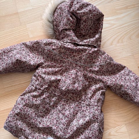 Wheat Frida pige jakke i størrelse 128, farve grøn. Jakken har en aftagelig hætte med pelskant og er foret med blødt, hvidt materiale for ekstra varme. Designet til børn og egnet til koldt vejr.