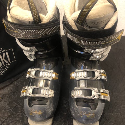 Dolomite X Perfect 90 dame skistøvler i størrelse 38/39 (24-24.5) sålen måler 24,5 cm Farven er en kombination af lilla og hvid med sølvdetaljer. Støvlerne har flere spænder for justering og en blød, isolerende indersål for komfort og varme ved skiløb.