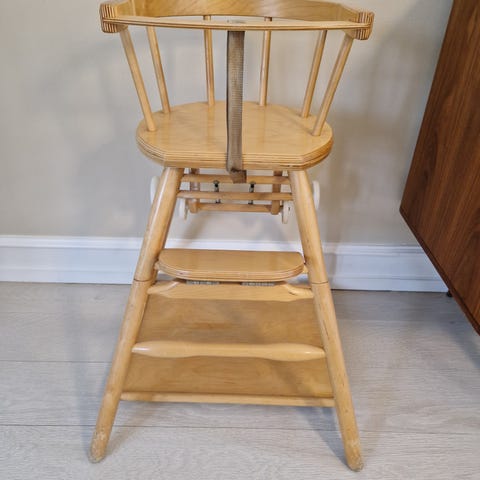 En dejlig stol med høje sider, så den lille sidder godt. Bordpladen er aftagelig og med høje kanter, så spild ikke så nemt falder på gulvet. Et rigtig godt møbel til spisning, når I har haft familieforøgelse.