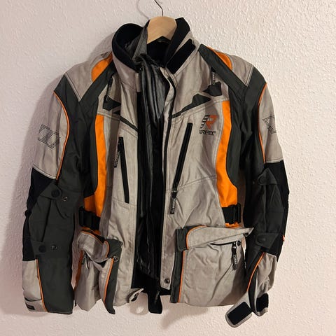Jeg har også matchende bukser til salg, som kan lynes sammen med jakken — en smart funktion, der giver ekstra beskyttelse ved styrt, så jakken ikke kryber op på ryggen. Et virkelig lækkert sæt og model.