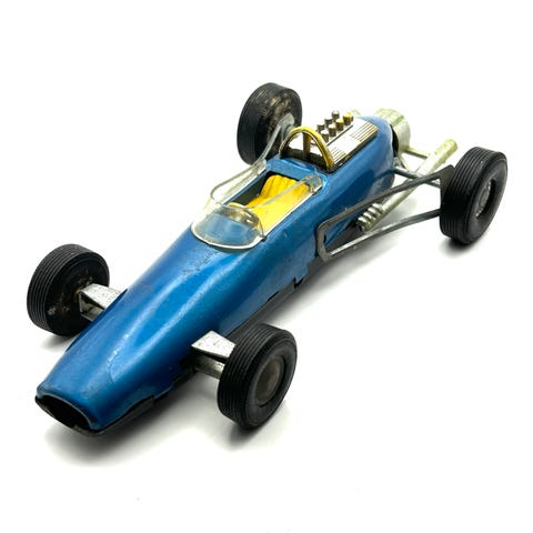Vintage rød racerbil modelbil med hvid stribe og nummer 11 på motorhjelmen. Modellen har sorte hjul og detaljeret interiør med sæder og rat. Fremstillet i metal og plastik, uden synlige skader, egnet til samling eller dekoration.