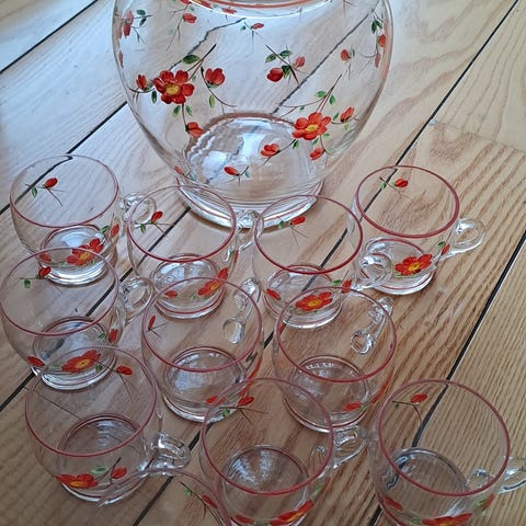 Design med tre elegante glaskuglefødder og låg med udskæring til servering. Perfekt til gløgg, punch, saft eller sangria.