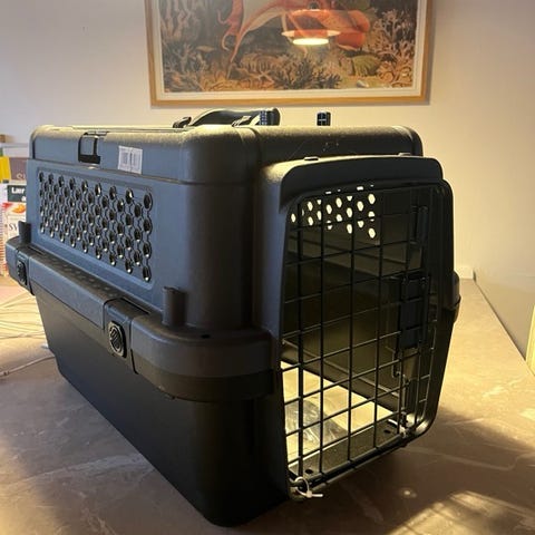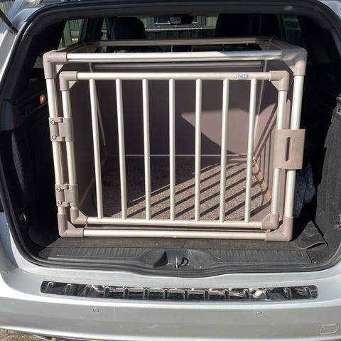 Trixie transportbur. Har været brugt til bordercollie størrelse. Se mål på billede. Lidt fugtskadet, se billede 4 men ellers i fin stand.