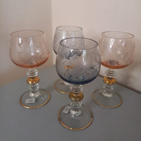 Glas, Pokaler, Pokaler i farvet let frostet glas, den ene blå er også på en anden annnoce. De andre er 16 cm høje og 9,7 - 12,3 cm høje.