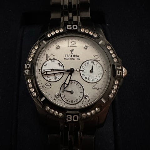 Flot festina dameur i rustfrit stål. Super feminint. Det er i pæn stand dog med et par ridser i glasset fra daglig brug. Skal have nyt batteri