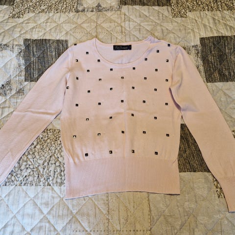 Cream Sweater i størrelse M, farven lyserød. Fremstillet i strikket materiale med detaljer som ribstruktur og flæsekant nederst. Designet til kvinder.